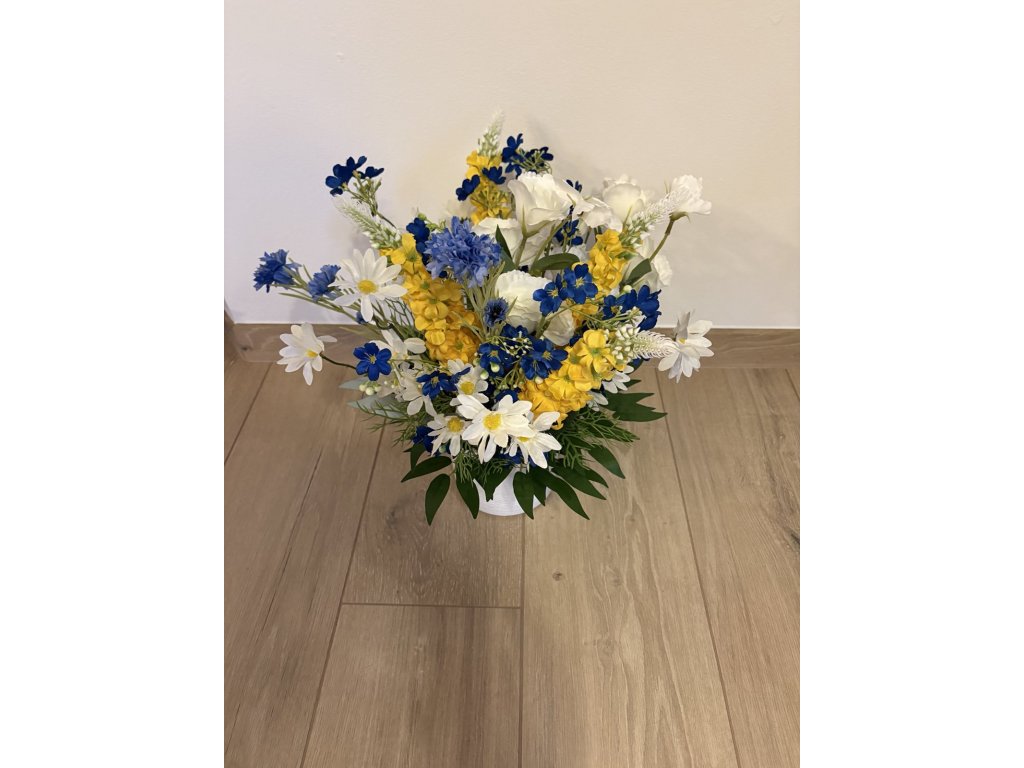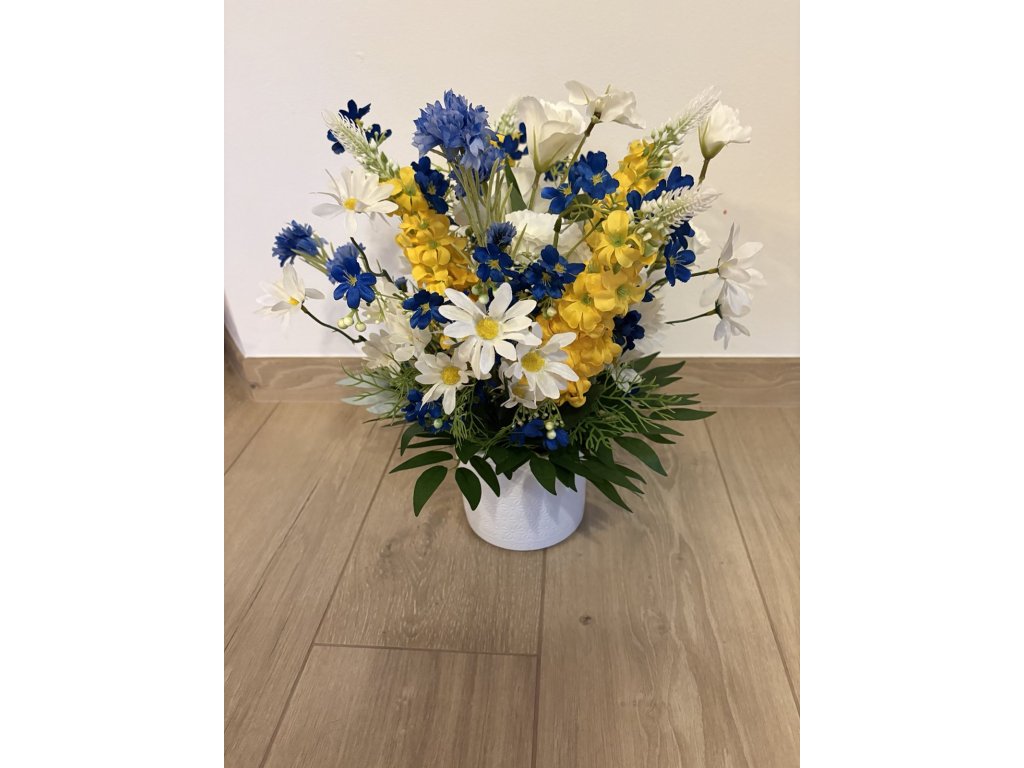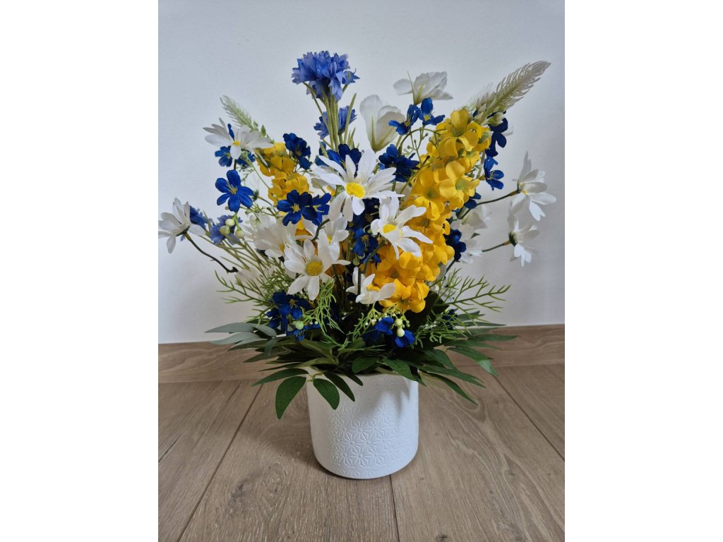 Květinová dekorace v modro - žlutých tónech obklopena bílými květy a vsazena do bílého keramického obalu.