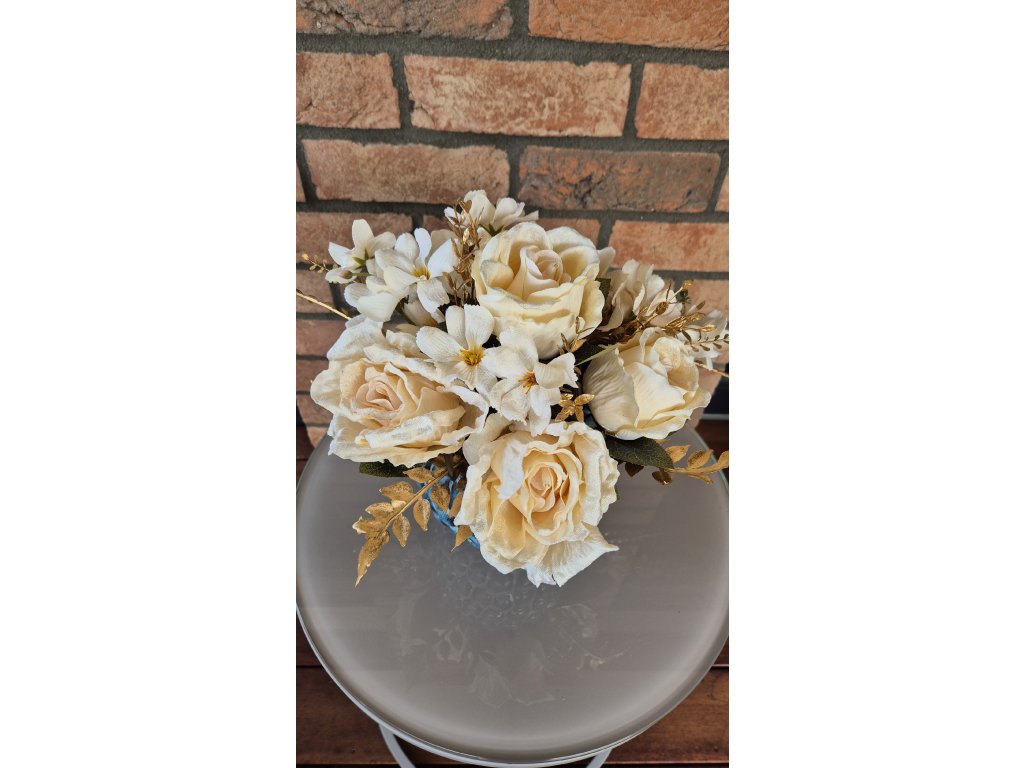 Luxusně vypadající květinová vazba, která nikdy neuvadne. Elegantní dekorace, která zapadne do moderní i rustikální domácnosti. Nádherně bude vypadat i na recepci nebo v kanceláři. Dekorace je vytvořena tak, abyste s ní mohli zdobit prostory celoročně. S prvkem zlaté skvěle zapadne i do vánoční výzdoby.
