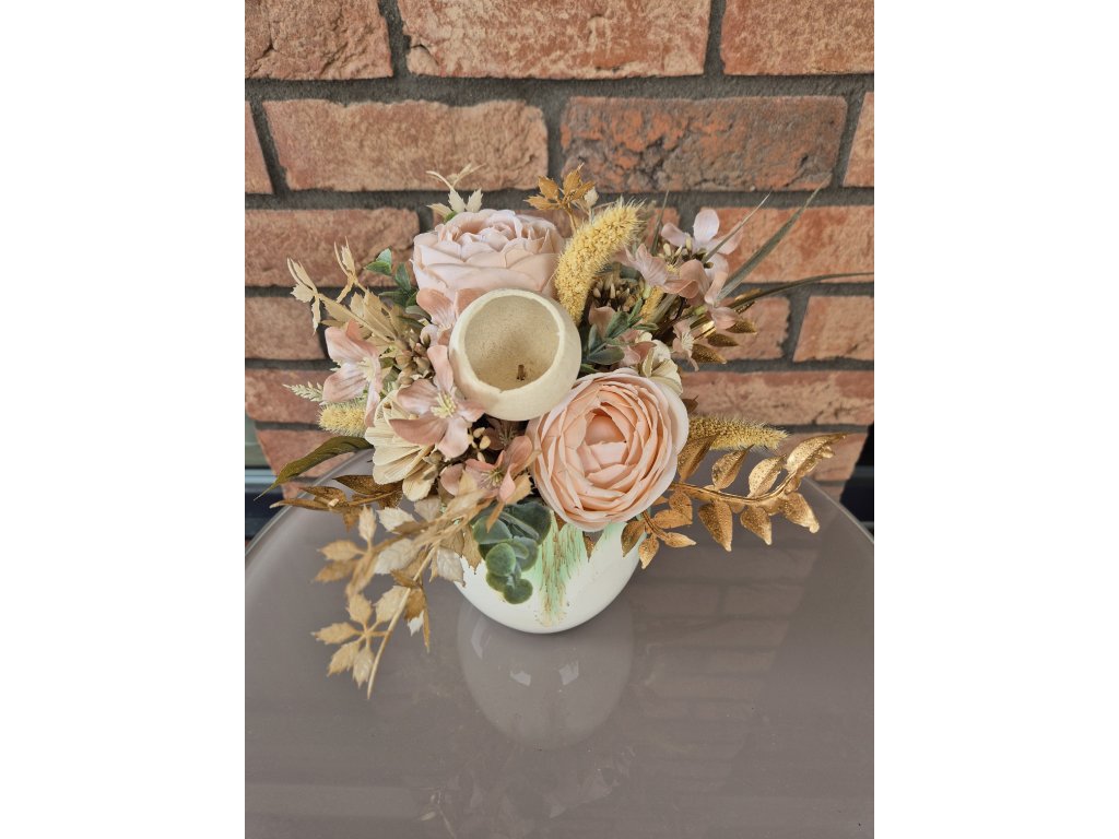 Jemná květinová dekorace, co nikdy neuvadne. Nádherně zpracovaná dekorace ve světlých tónech. Hodit se Vám bude do jakékoliv domácnosti. Dekorace je vytvořena tak, abyste s ní mohli zdobit prostory celoročně. S prvkem zlaté skvěle zapadne i do vánoční výzdoby.