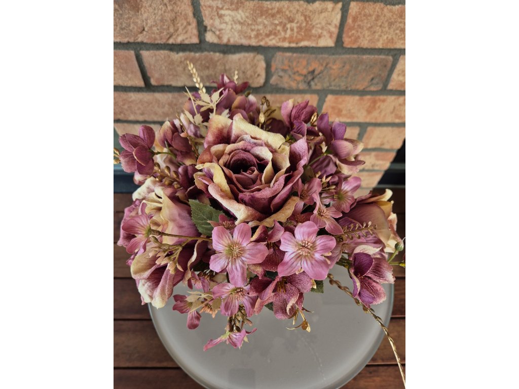 Květinová vazba v luxusních barvách. Elegantní dekorace, která zapadne do moderní i rustikální domácnosti. Nádherně bude vypadat i na recepci nebo v kanceláři. Dekorace je vytvořena tak, abyste s ní mohli zdobit prostory celoročně. S prvkem zlaté skvěle zapadne i do vánoční výzdoby.
