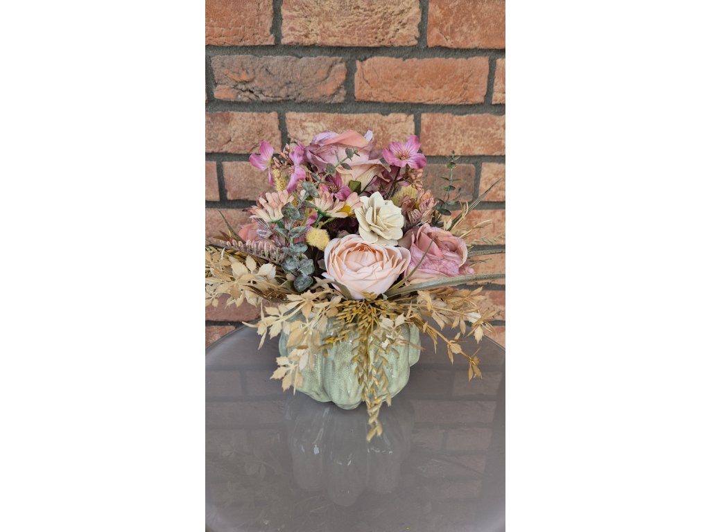 Podzimní květinová vazba s prvky růžové a zlaté. Elegantní dekorace, která zapadne do moderní i rustikální domácnosti. Nádherně bude vypadat i na recepci nebo v kanceláři. Je vytvořena tak, abyste s ní mohli zdobit prostory v období jaro, léto, podzim. Dekorace, co nikdy neuvadne.