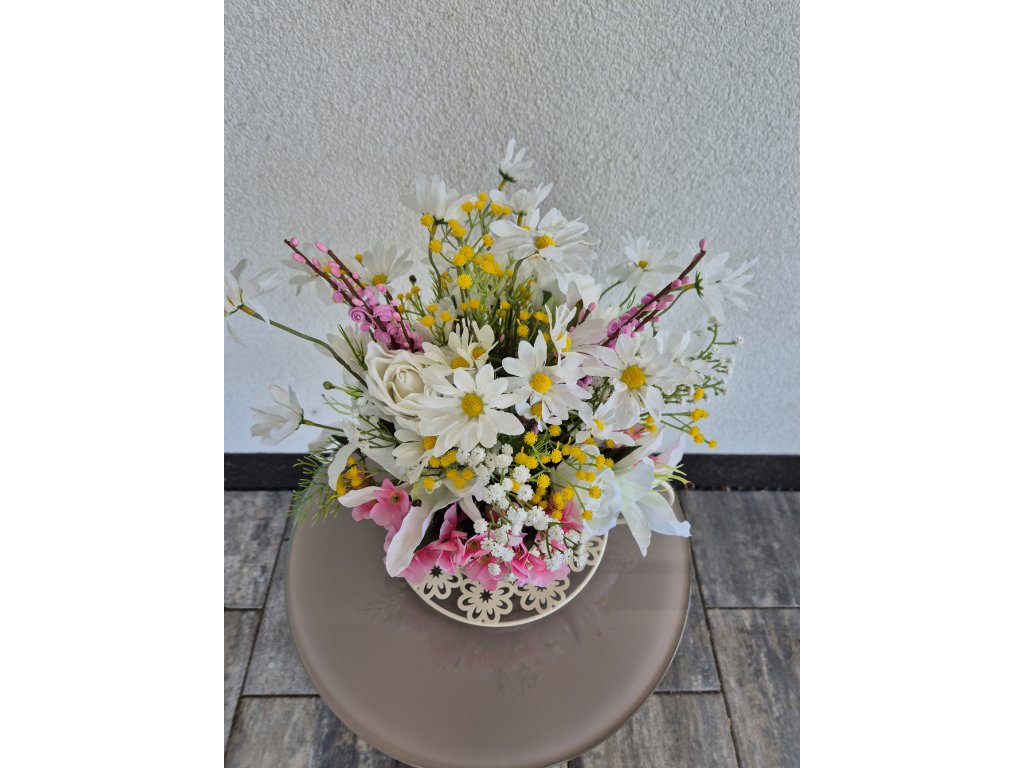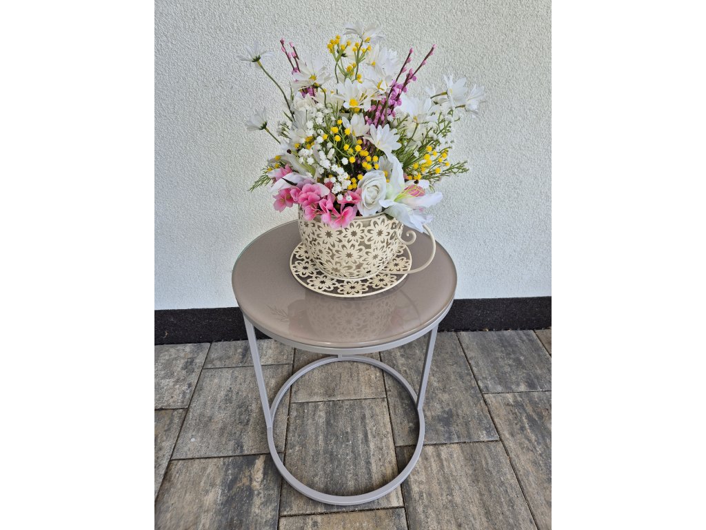 Květinová dekorace v plechovém šálku. Umělé květy.