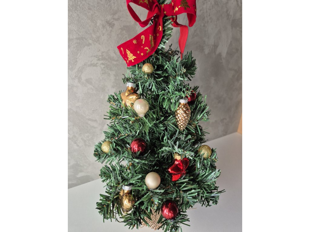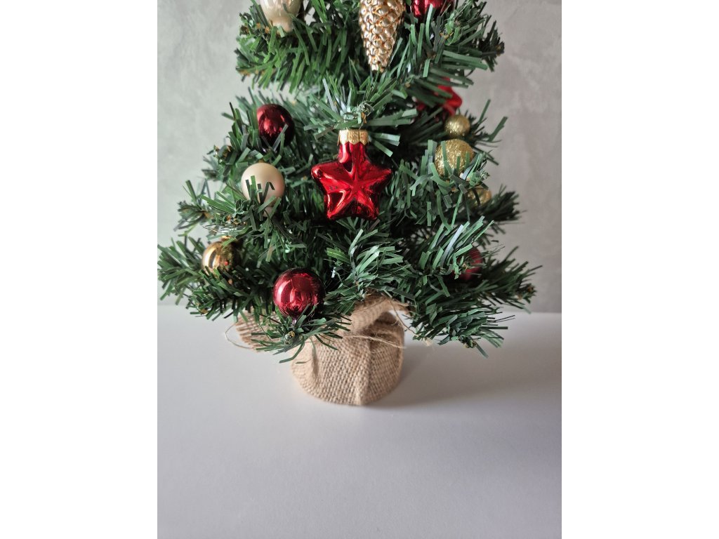 Maličký umělý vánoční stromek v jutovém obalu. Zdoben skleněnými ozdobami a textilní mašlí.