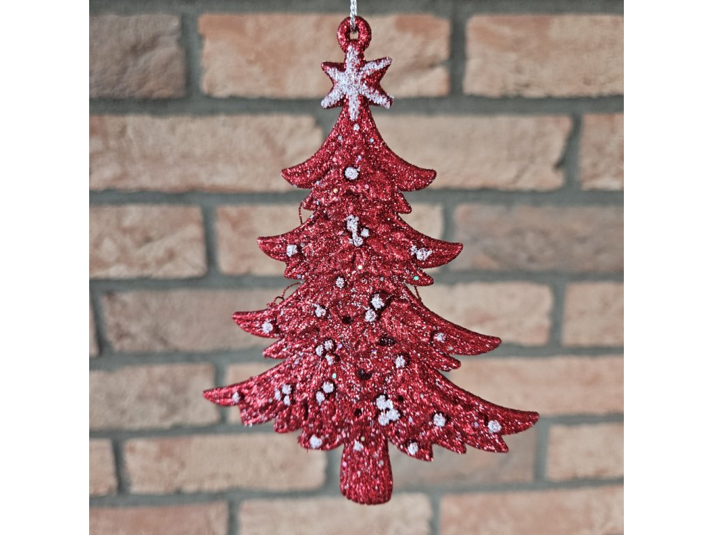 Závěsná ozdoba se třpytem ve tvaru stromečku.