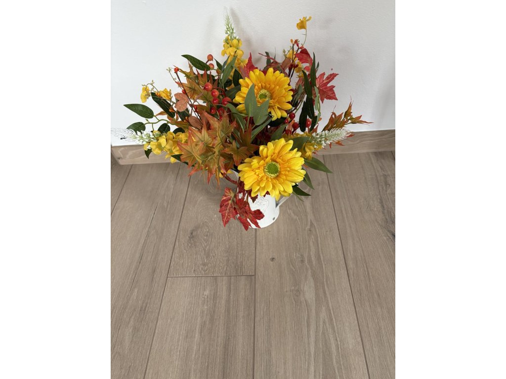 Vneste do svého domova hřejivou atmosféru podzimu s tuto okouzlující květinovou dekorací. Bohatá kombinace žlutých květin, červených bobulí a typických javorových listů působí přirozeně a vkusně. To vše je zasazeno do elegantního plechové džbánu s jemným reliéfem, který dodává venkovský šarm. Skvěle ladí s podzimními doplňky a přírodními materiály. Vhodná i jako dárek pro milovníky sezónních dekorací.