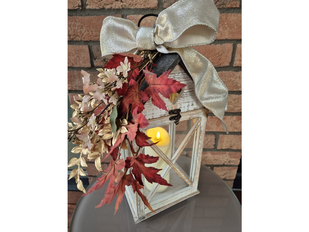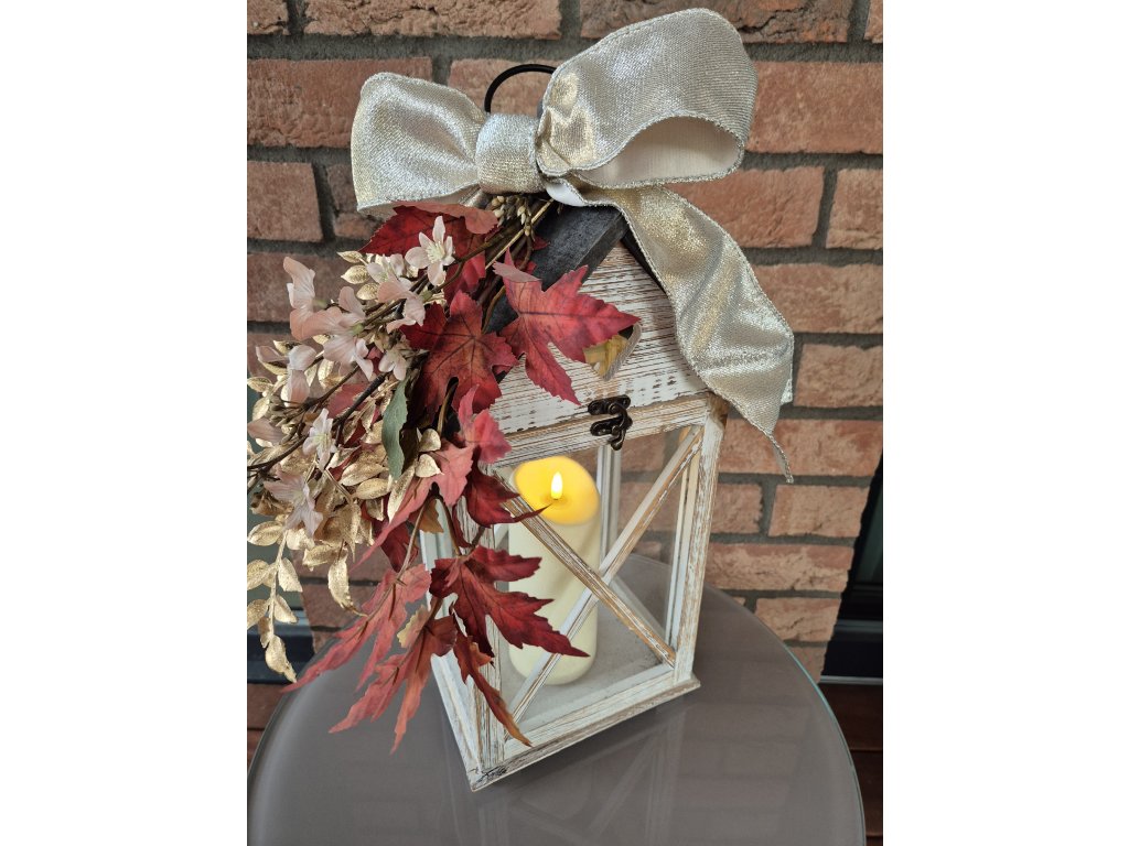 Elegantní lucerna s podzimní výzdobou přináší teplou a útulnou atmosféru do vašeho domova nebo k vaším dveřím. Dřevěná lucerna v bílé patině má prosklené stěny a ozdobné kovové zavírání a ucho. Lucerna je zdobena výraznou podzimní aranží. Celý dekor je završen velkou luxusní mašlí ve zlatavě stříbrném odstínu, která dodává produktu slavnostní nádech. Dekorace, se kterou pozvolna přejdete z podzimního do vánočního období. Svíčka není součástí.