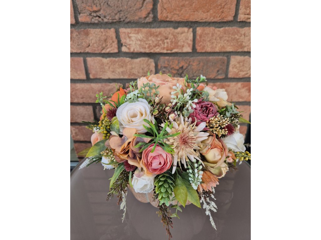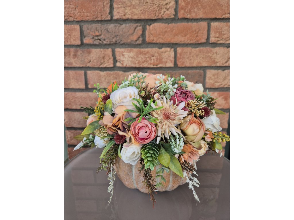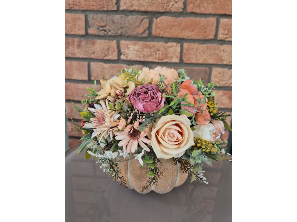 Originální podzimní dekorace ve tvaru dýně plná nádherných květin v tlumených pastelových tónech. Aranžmá kombinuje růže, chryzantémy, sedmikrásky a další podzimní prvky v harmonickém celku, který zaujme na první pohled. Ideální na stůl, parapet, poličku nebo jako sezónní dárek. Dekorace, která nikdy nezvadne.