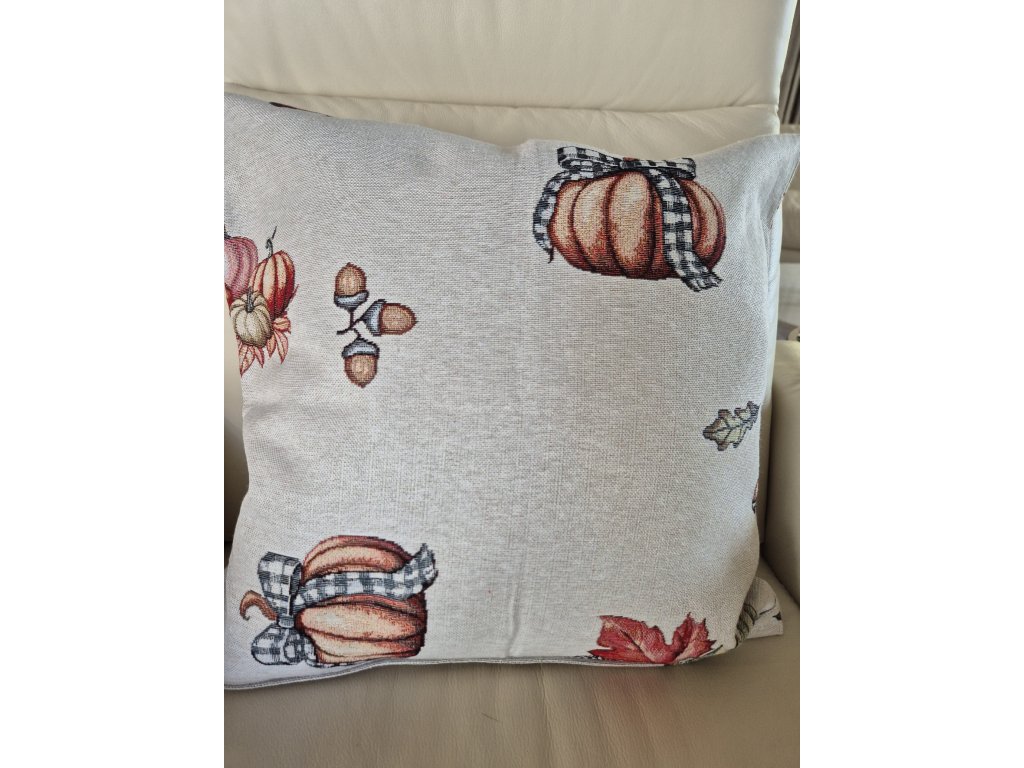 Dekorační povlak v podzimním stylu. Ideální pro oživení sedací soupravy, křesla nebo postele v období podzimu. Motivy dýní s černobílou stuhou, žaludů a podzimních listů dodávají polštáři rustikální a útulný vzhled.