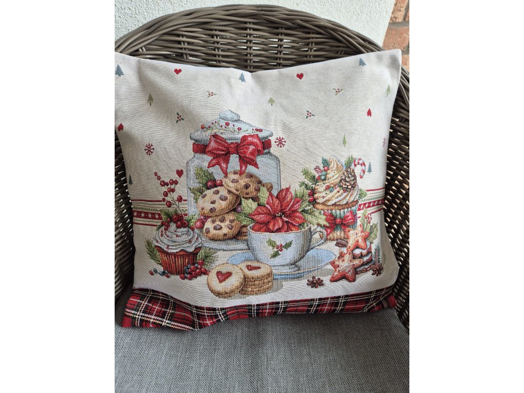 Oblíbené vánoční cukroví, šlehačkové dortíky a čoko sušenky. Vzor v tradičních vánočních barvách na béžovém podkladu. Hodit se vám bude do jakékoliv domácnosti. Skvěle se bude vyjímat i na chalupě.