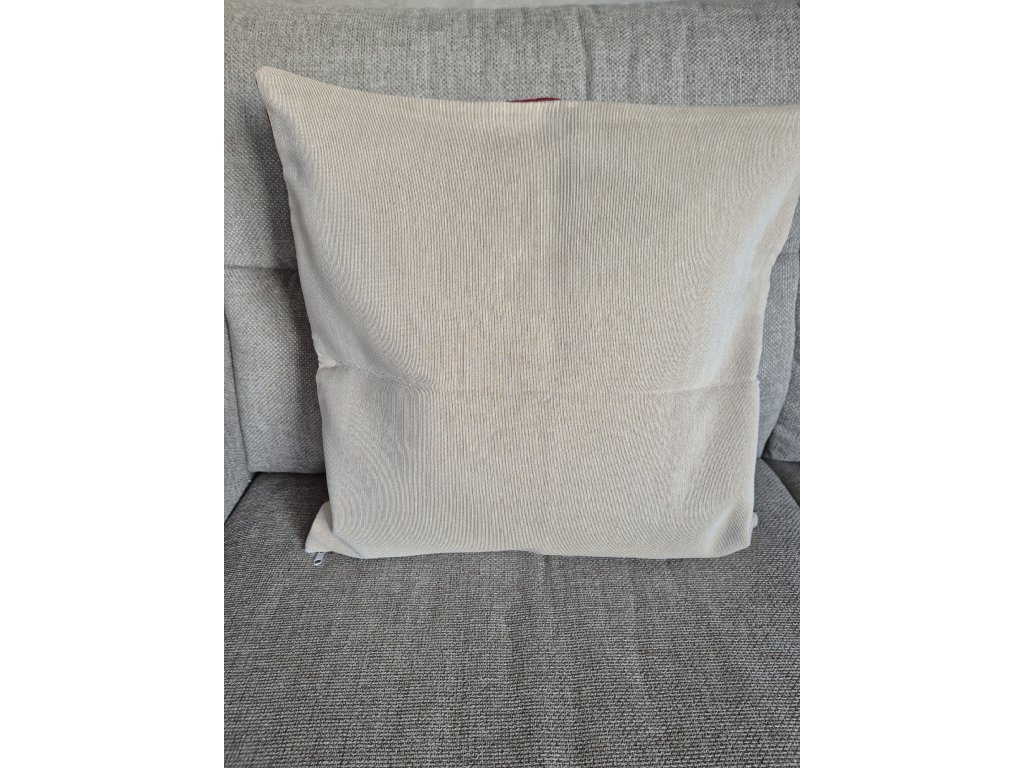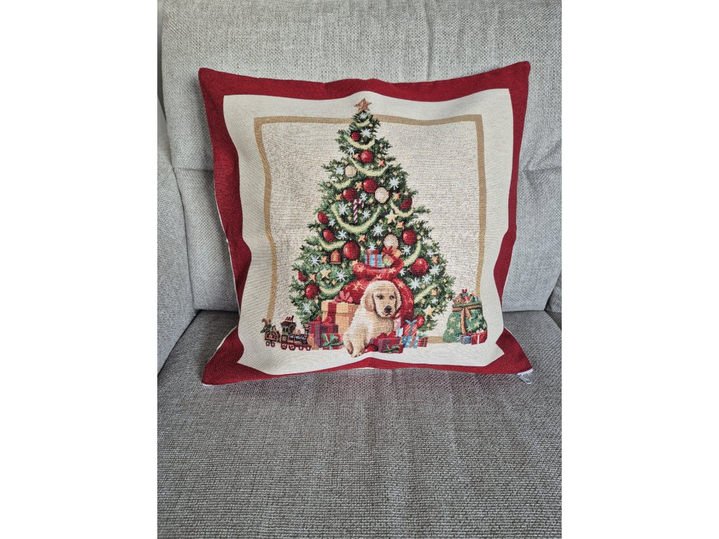 Povlak na polštářek s motivem vánočního stromku, dárečků a roztomilého štěňátka. Motivy v klasických vánočních barvách.
