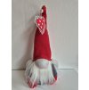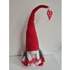 Textilní skřítek s vysokou čepicí, na které má zavěšené srdíčko.