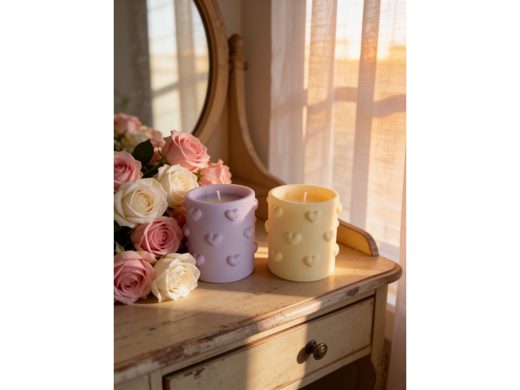 Veselé nádobky se srdíčky z ekologického materiálu, v barvách jara a léta. Svíčka je s vůní višně a marcipánu.
