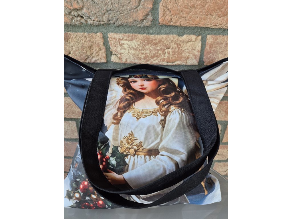Taška s motivem andělíčka na modré. Praktická, skladná do kabelky, vždy po ruce. Hlavní část na zip, zadní kapsička na zip.