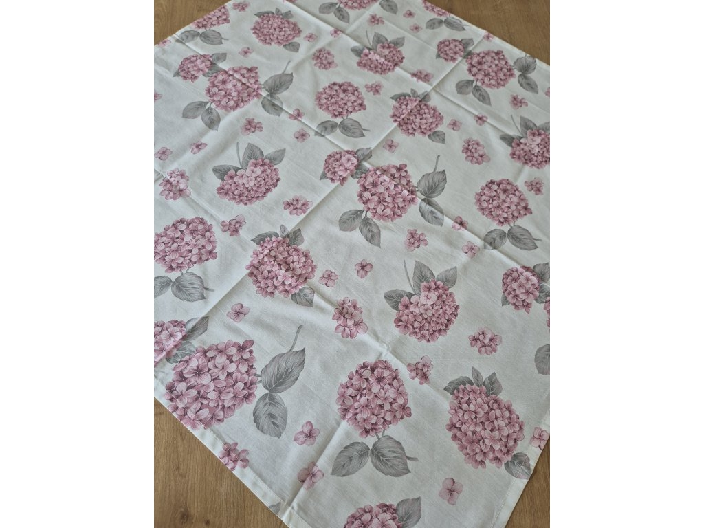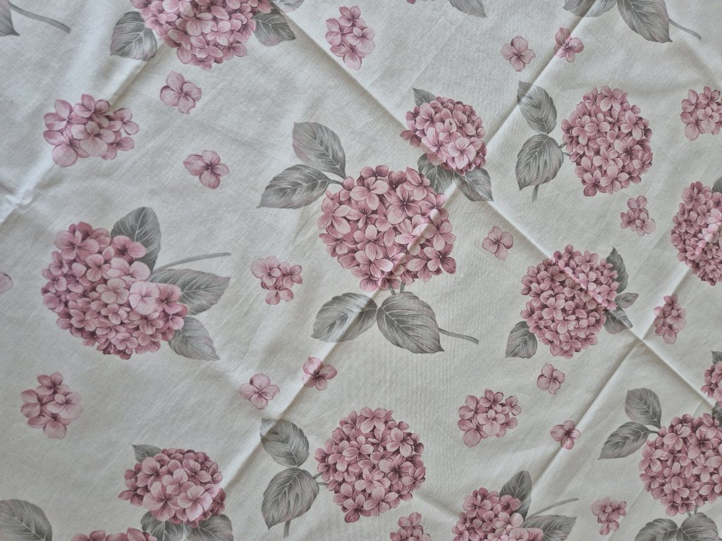 Ubrus s jemnými květy hortenzií.