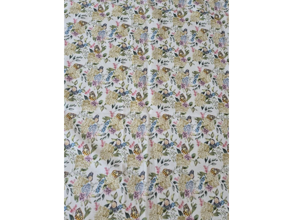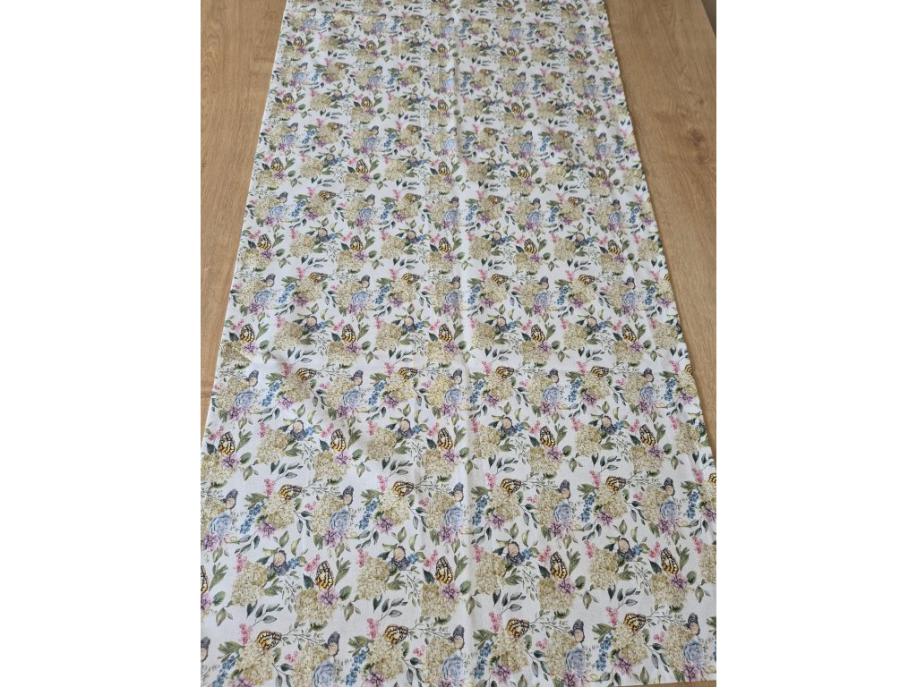 Ubrus s květy a motýlky.