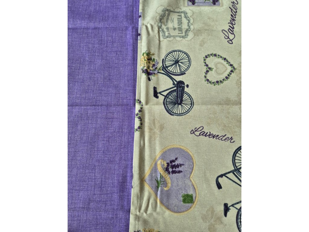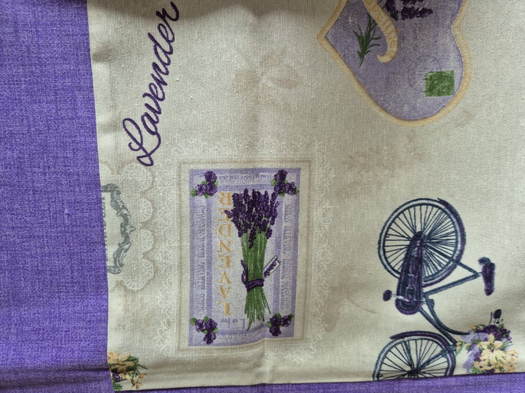 Ubrus s levandulovým motivem uprostřed lemován čistě fialovými okraji v barvě levandule.