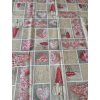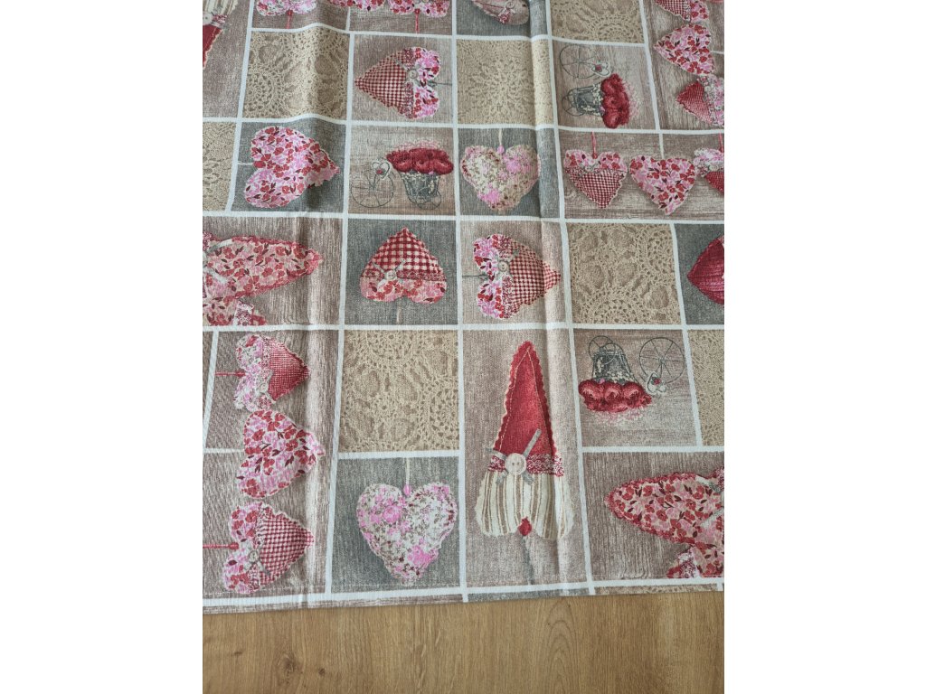 Ubrus s růžovými šitými srdíčky na béžovém podkladu.