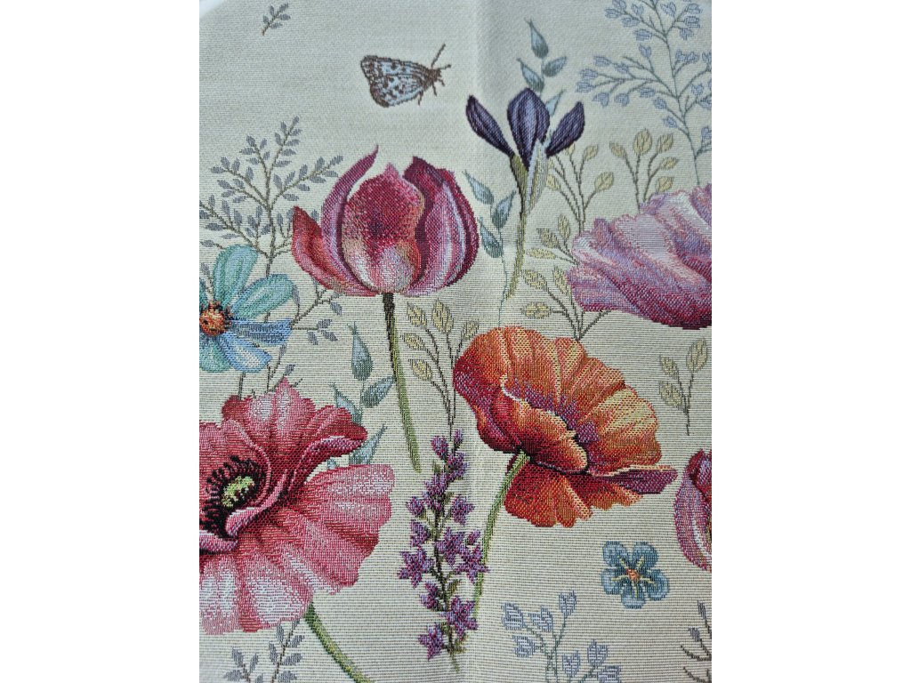 Ubrus s motivem květů a motýlů v nádherných barvách.