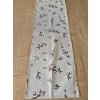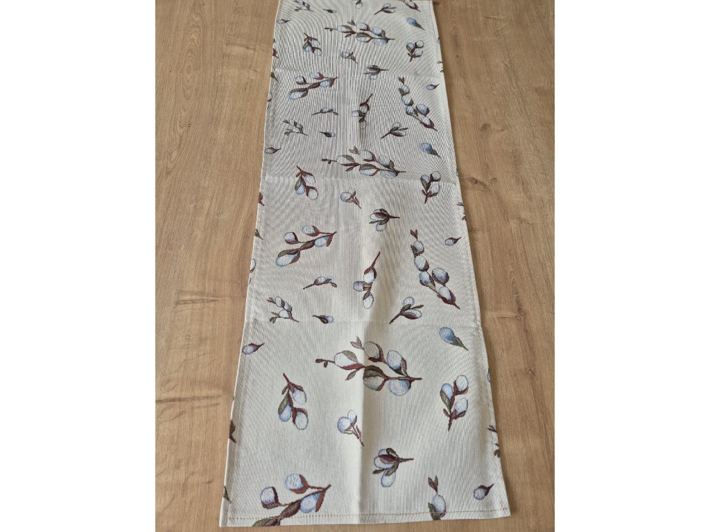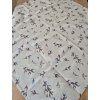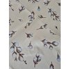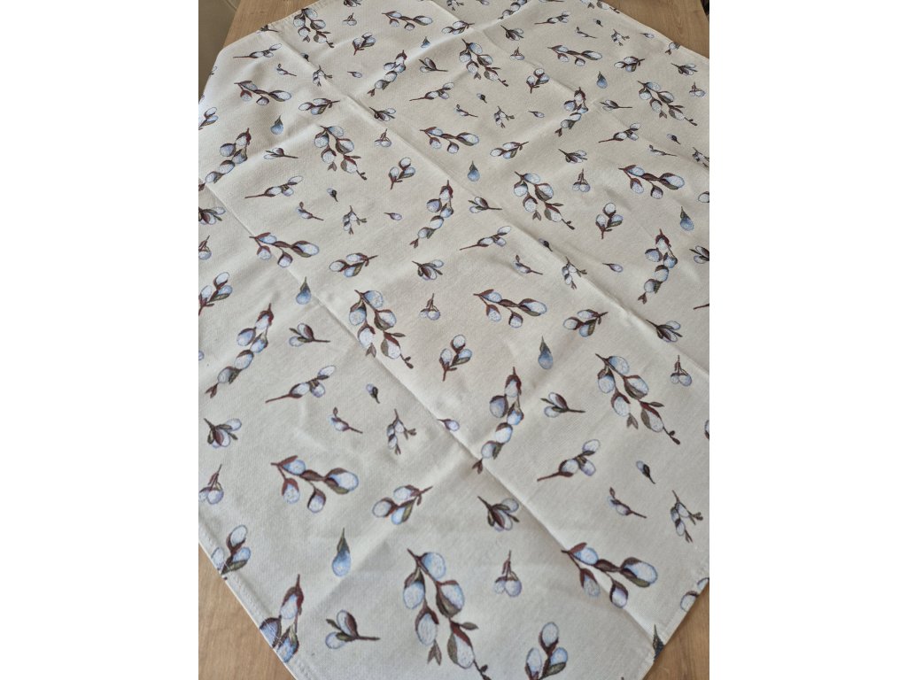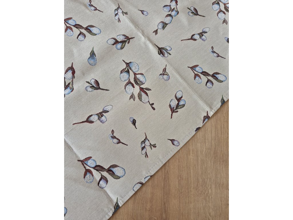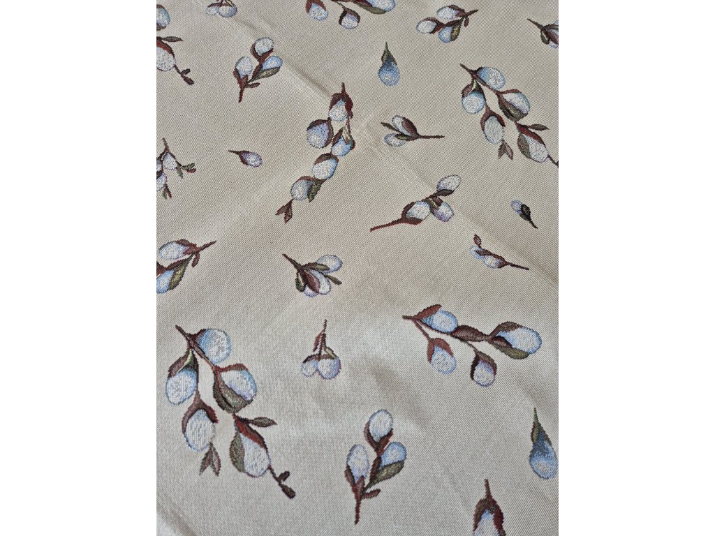 Ubrus z pevné látky s jemným vzorem větviček na béžovém podkladu.