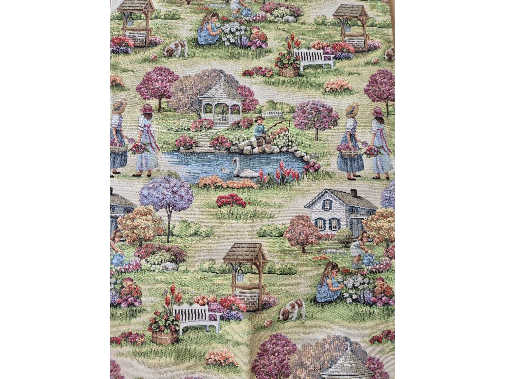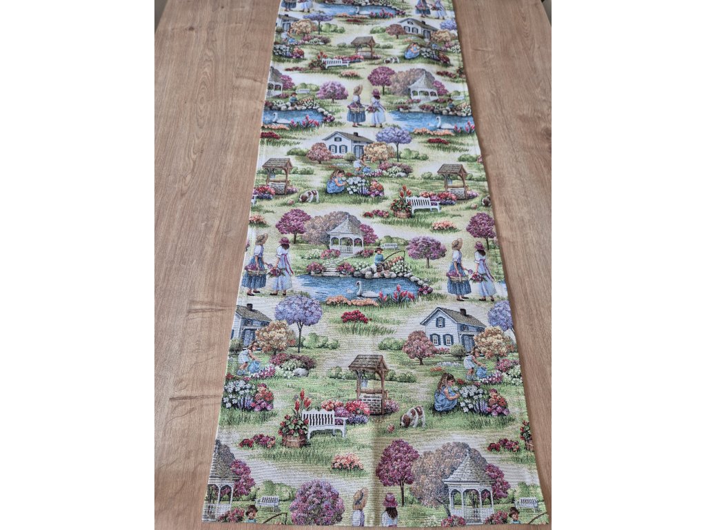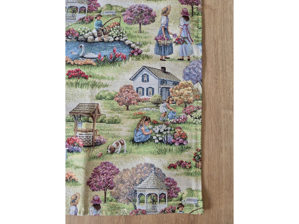 Nádherně zbarvený ubrus s motivem zahrady.