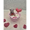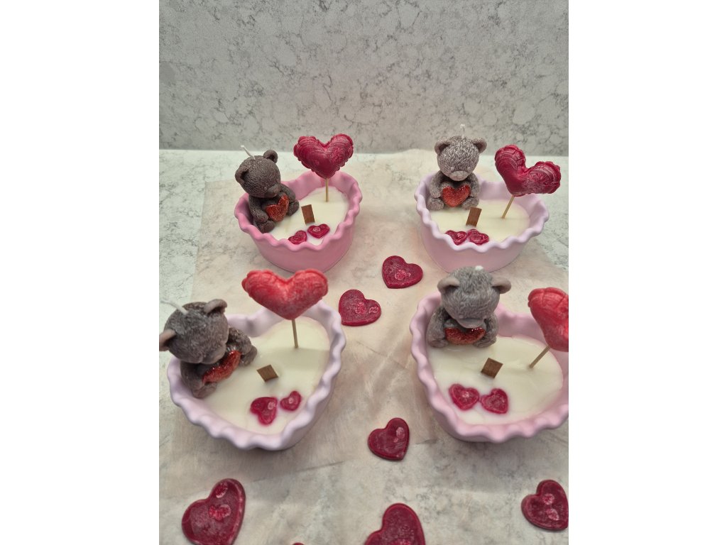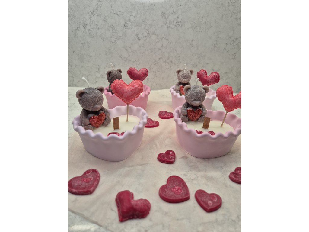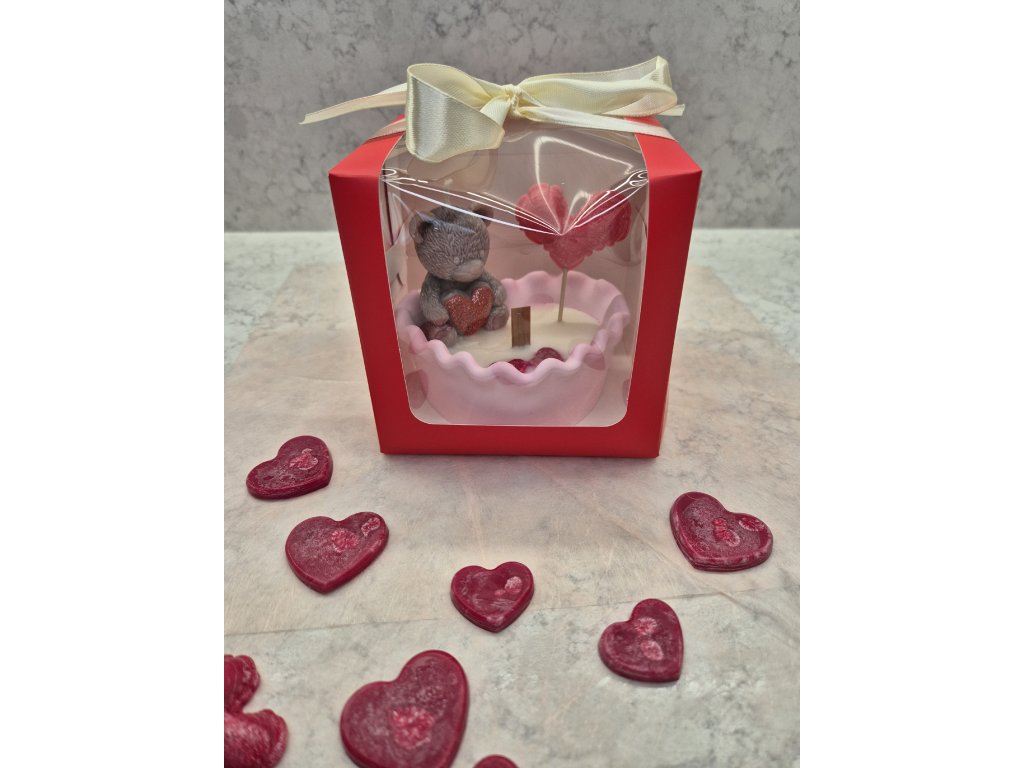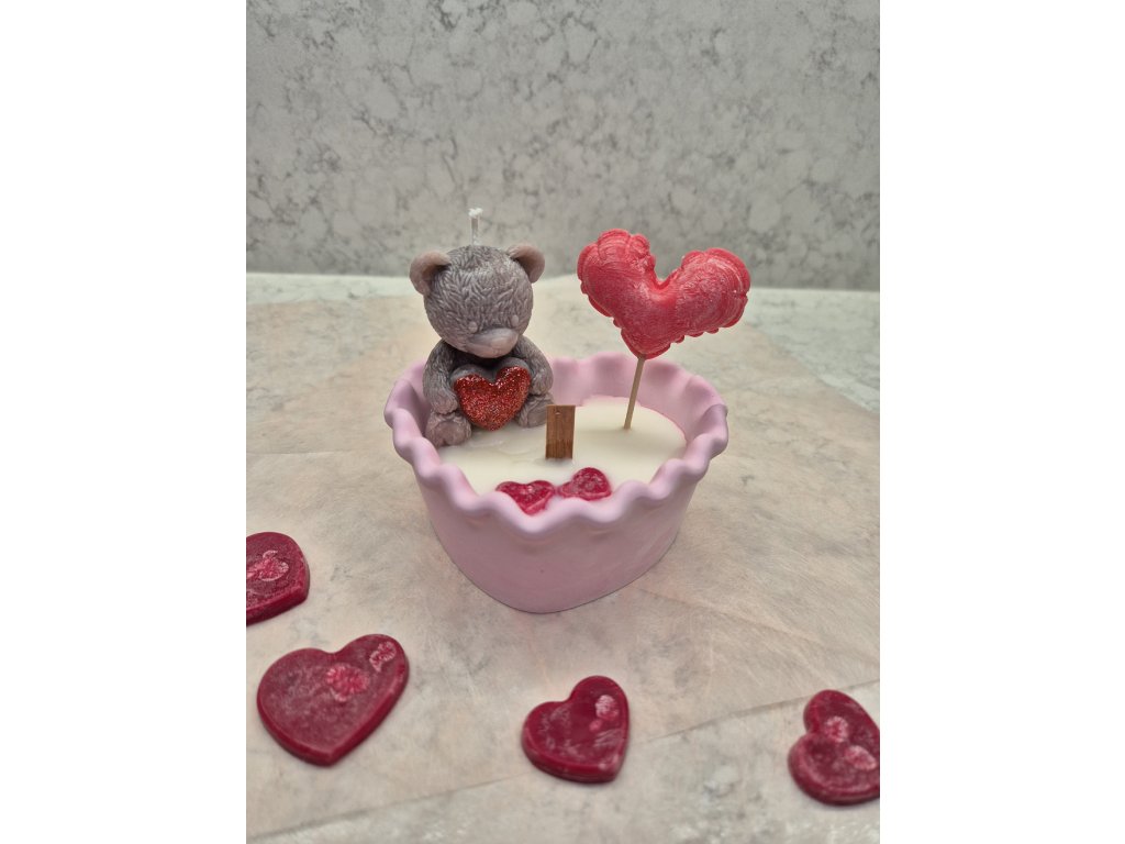 Roztomilý medvídek se srdíčky v misce ve tvaru srdce vyrobené z ekologické hmoty. Set je ideální volbou pro obdarování na svátek sv. Valentýna. Potěší malé i velké, kamarádky, kolegyně.... Svíčka v nádobce je s vůní jahod.